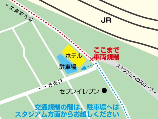 マツダスタジアムにて試合が行われる日は、ホテル正面の、広島駅からスタジアムまでの道路が交通規制となります。その為、駐車場をご利用のお客様におかれましては、スタジアム側の道路よりお越しくださいますようお願いいたします。