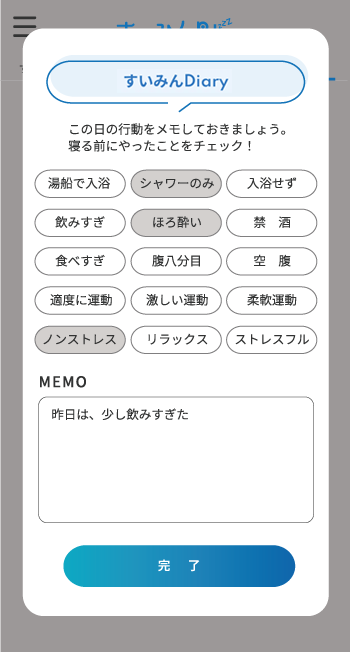 When you wake up in the morning, check the app for your sleep data collected the night before. You can also write a little note to self in the Suimin Diary.